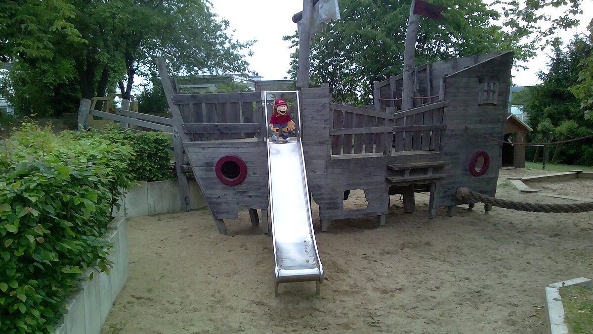 Unser großes Außengelände kommt dem zentralen kindlichen Bedürfnis nach Bewegung in vielfältiger Form entgegen. Die Kinder haben einerseits ausreichend Platz zum Bewegen, andererseits finden sie kleine ruhige Nischen für Rollenspiele, Erzählrunden, Verstecken, Matschen, Entdecken, Beobachten und Toben. Natur und ansprechende Spielgeräte, wie das große Piratenschiff ergänzen sich bei uns gegenseitig. Der Spielplatz verbindet verschiedene Spielräume miteinander, wo die Kinder sich bewegen, ihre Phantasie entwickeln können und verschiedene Sinne angesprochen werden. Die unterschiedlichen Bepflanzungen schaffen unterschiedliche Spielatmosphären (z.B. Büsche zum Verstecken).